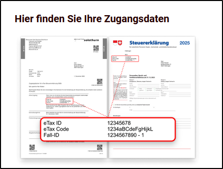 Ihre Zugangsdaten befinden sich beim Erhalt des Formulars im Format A4 auf dem Begleitbrief «Zugangsdaten für eTax Steuererklärung 2025» unterhalb des Einleitungstexts beim Absatz «eTax Zugang» (siehe Bild links).
